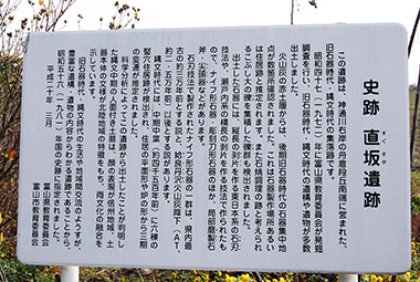 直坂遺跡は、神通川が神通峡を下り富山平野に抜ける神通川右岸の舟倉段丘南端に営まれた古代の集落跡です。1972年(昭和47年)の発掘調査で、旧石器時代及び縄文時代草創期・早期・中期にわたる各時期の遺物・遺構が出土しました。旧石器時代の地層からは約2万5千から3万年程前の多数の石刃をはじめナイフ形石器(動物の皮や肉を切ったと考えられる道具)、彫器(骨や木に溝を彫るための工具)、局部磨製石斧などが出土しています。縄文時代の層からは、6棟の竪穴住居が検出されました。ここから出土した縄文中期の人面付き土器は、顔の表現が信州地域、土器本体の文様が北陸地域の特徴を持ち、両文化の融合を示しています。旧石器時代・縄文時代の生活や地域間交流の様子が分かる豊富な遺物・遺構の内容と重要性から、1981年(昭和56年)国の史跡に指定されました。直坂遺跡は、立山黒部ジオパークの文化サイトに登録されています。