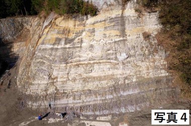 【写真1】「稲村のスランプ構造」まだ固まっていない堆積物が海底をすべり下り(海底地すべり)、崩れずにぐにゃりと曲がったようすをスランプ構造と呼びます。このスランプ構造は、およそ1600万年前に海底斜面でできたものです。 【写真2】「スランプしていない正常堆積物」スランプ構造の左側の露頭では、正常な状態の地層の重なりが観察できます。白っぽい荒い砂から暗灰色の泥まで、上に向かって粒が細かくなる地層の組み合わせが何枚も重なっています。砂が泥に変わるあたりに黒い胡麻粒にような生痕化石がたくさん見つかります。スランプ構造を形成したのは上部に見える、それぞれの特徴の異なる8枚の砂泥の地層です。 【写真3】「繰り返す地層」露頭面右に小さな折り返しが見えます。この面全体では、スランプ構造を形成した8枚の地層全部、または一部が少なくとも3回繰り返して重なっていきます。上部にはスランプ形成を引き起こしたと考えられる2枚の凝灰岩の土石流堆積物と、軽石凝灰岩層が重なります。 【写真4】「スランプ前面の断面」下から正常堆積物、次にスランプをつくる地層が2回繰り返しています。さらに、2枚の凝灰岩層と軽石凝灰岩層がはっきりと観察できます。1枚目の凝灰岩層の中ほどと、2枚目の凝灰岩層の底面に不規則な形をした泥岩の礫が含まれていますが、これは凝灰岩が土石流となって水中を流れるときに先に堆積した泥を削り、取り込んだものです。